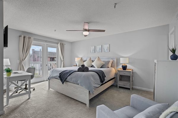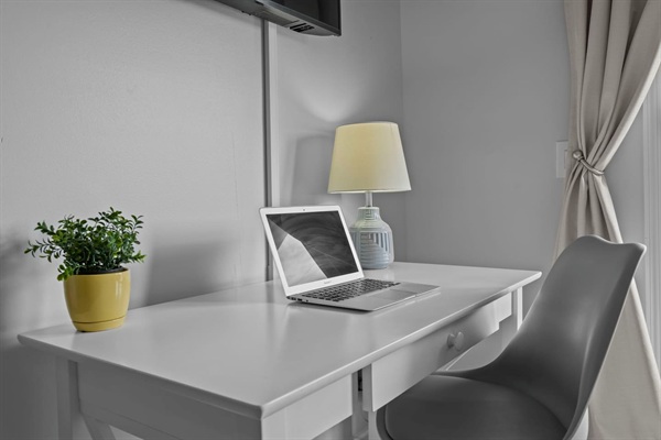 Work station in primary bedroom with large screen smart TV