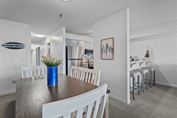 Inside dining area with seating for six, plus alternative options at the kitchen.