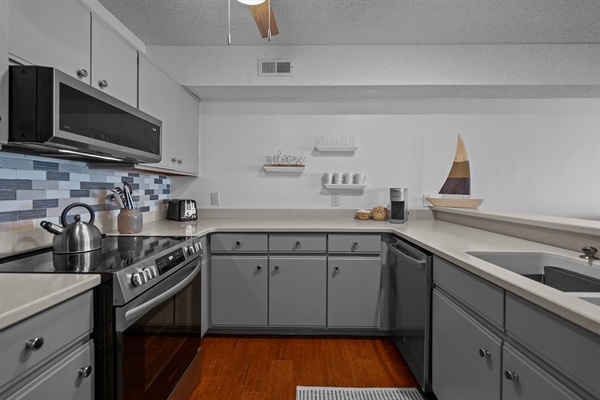 Recently updated kitchen stock full of cooking supplies.