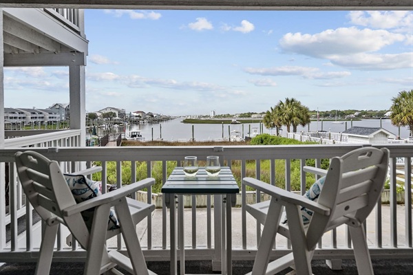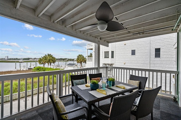 Back porch with additional seating for 6 and stunning views of the canal. Watch the sunset and fireworks in the summer.