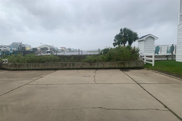 Additional back property view from canal with beach in background.